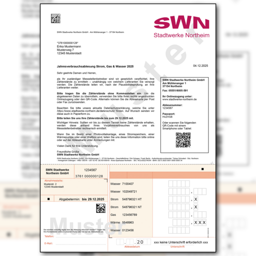 Wenn Sie von uns Post erhalten oder unser Ableser Sie nicht angetroffen hat, können Sie uns Ihre Zählerstände direkt über die entsprechenden Internetportale für unsere Jahresablesung in Northeim melden.